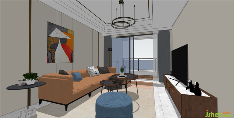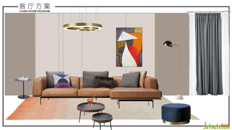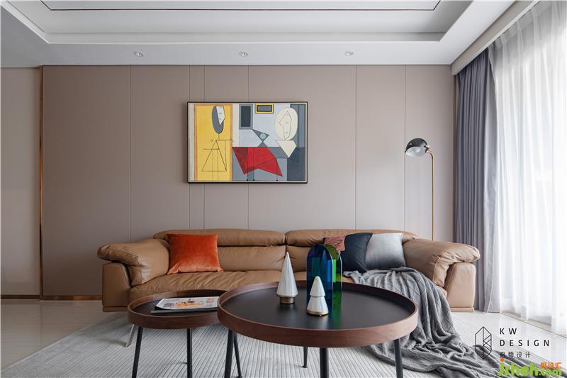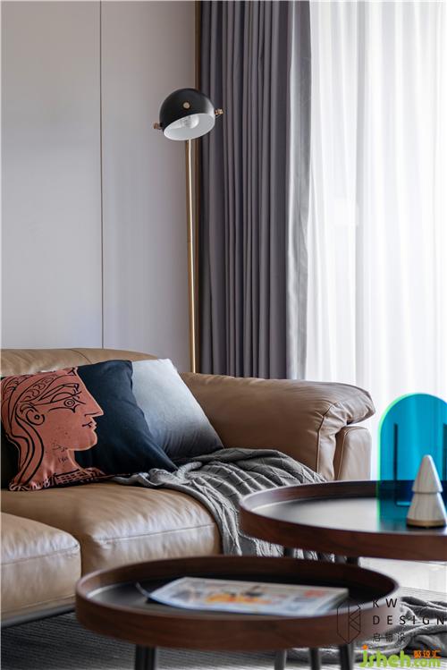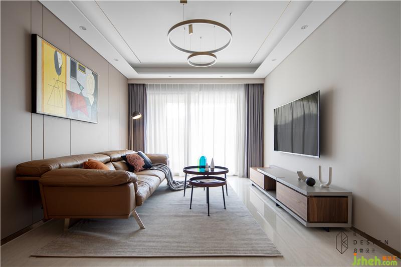 軟裝方案:室內(nèi)設(shè)計(jì)師結(jié)合輕奢和簡約風(fēng)格元素,搭配簡約輕巧型家具。棕橙色皮質(zhì)沙發(fā),上下呼應(yīng)的大小圓形組合拼接的吊燈和茶幾,極簡線條金屬落地?zé)?,搭配素色窗簾和地毯,使整個(gè)空間靈動(dòng)活潑。