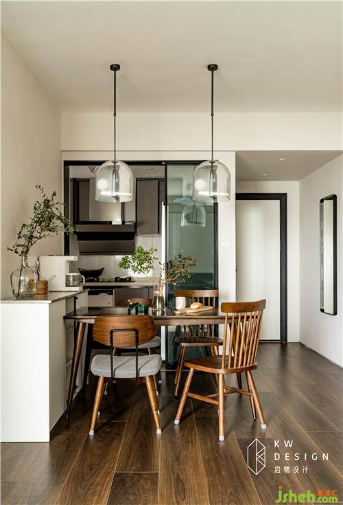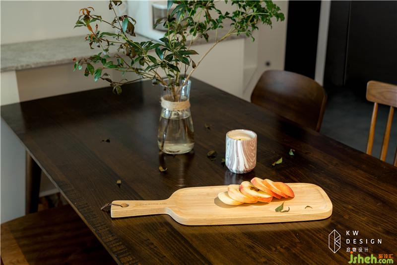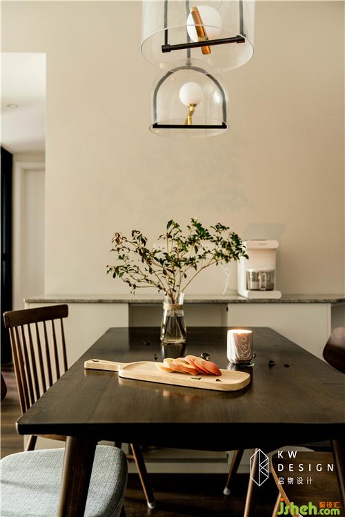 圓潤柔和的胡桃木餐桌椅搭配白色餐邊柜為屋主提供舒適有格調(diào)的用餐環(huán)境。