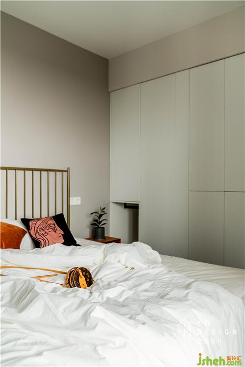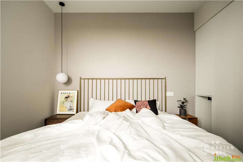 延用總空間的素雅基調(diào),主臥墻面加了些粉調(diào),符合女屋主浪漫可愛的性格。不拘泥于某種風格,結合屋主喜好的元素進行設計手法的調(diào)和,讓空間極具個性。