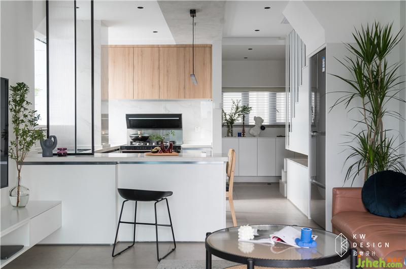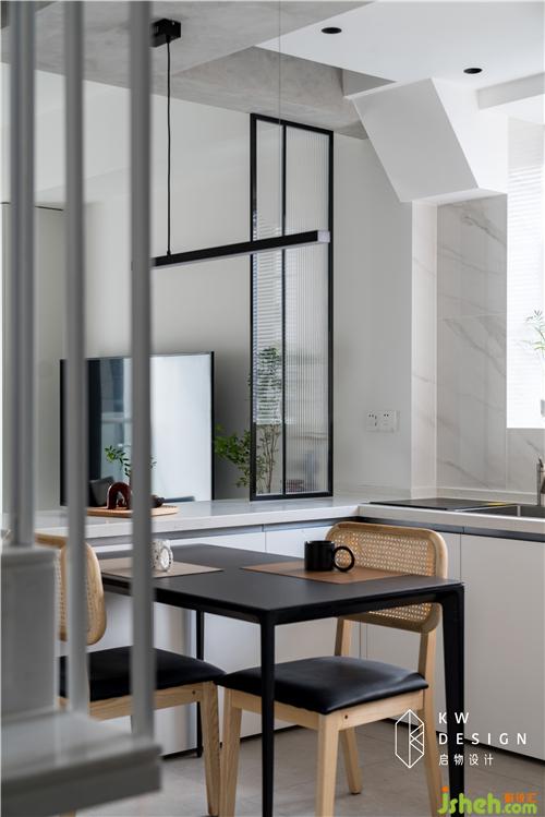 3.U字形開放廚房增加餐廚收納功能,靠近客廳一邊做輕食區(qū)和吧臺(tái)功能,連接定制的1.2m餐桌,無論是二人世界還是朋友聚餐大平臺(tái)完全滿足,利用率最大化。