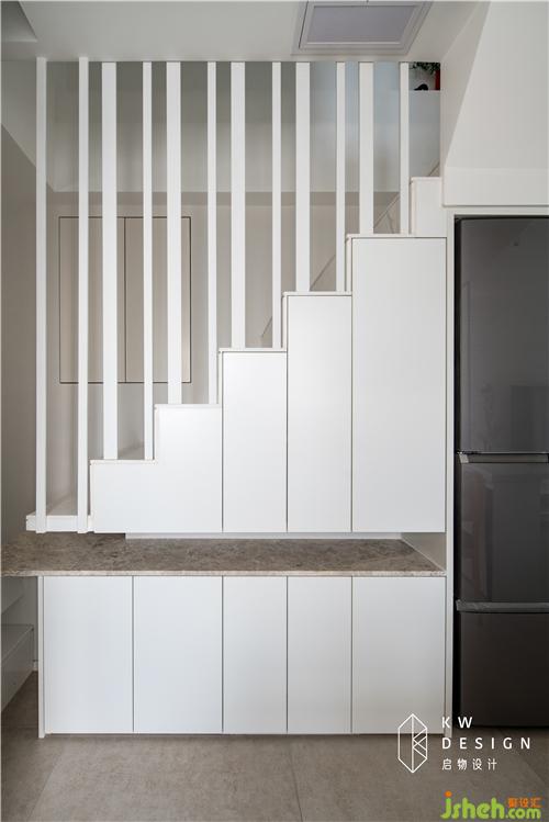 1.取消進(jìn)門左邊樓梯的墻體,原雙跑道樓梯改為直跑,三級(jí)改兩級(jí),減少地面空間,玄關(guān)空間頓時(shí)也開闊了許多。同時(shí)加寬樓梯寬度,由原本的70公分增加到75公分,踏步寬度從20增加至23公分,讓上下樓梯的舒適度盡可能達(dá)到最高。