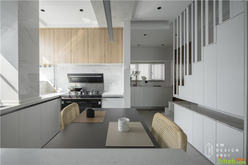 2.只有衛(wèi)生間與廚房空間互換,功能動(dòng)線才能達(dá)到最佳,還能完成互動(dòng)性極強(qiáng)的LDK一體化空間。室內(nèi)設(shè)計(jì)師因?yàn)樾路恐饕荕iss Z和MR L兩人居住,一樓衛(wèi)生間決定取消淋浴功能,只做干區(qū)使用,把更多空間留給廚房和餐廳。1.3m開間滿足兩人日常進(jìn)出使用習(xí)慣,用隱形門弱化此功能區(qū),讓一樓呈現(xiàn)更加開放完整的公共空間。