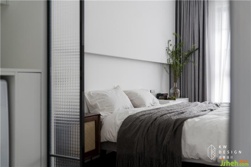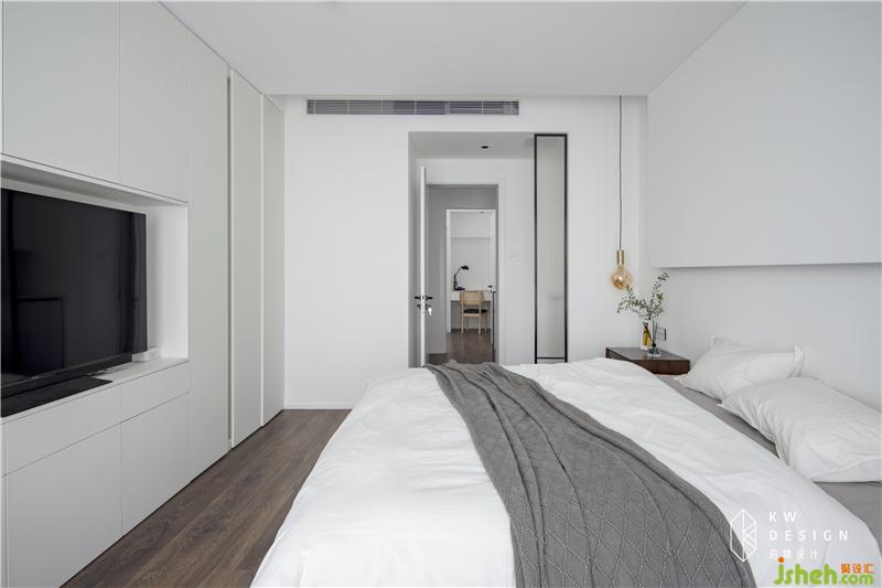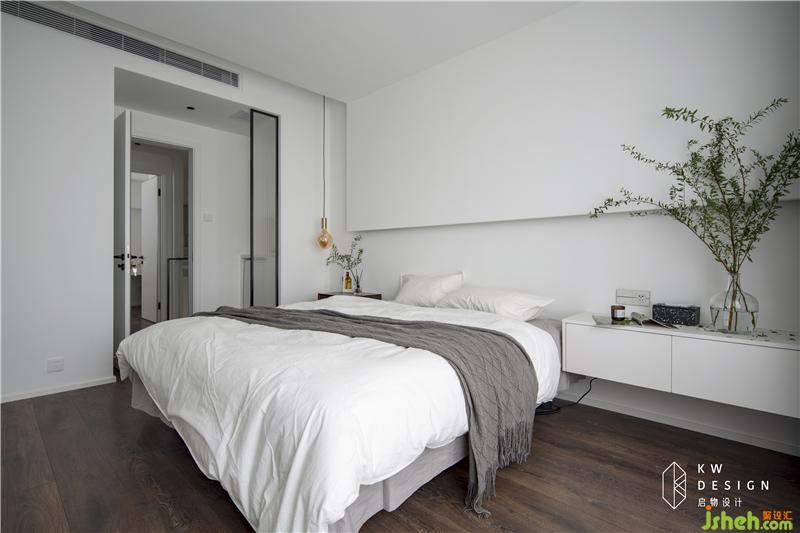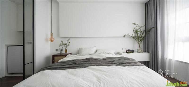 床頭平面造型分割在合適的高度,自然光投下的陰影,亦或暗藏?zé)魩У墓庠?,都讓這片白顯得獨(dú)特高級(jí)。