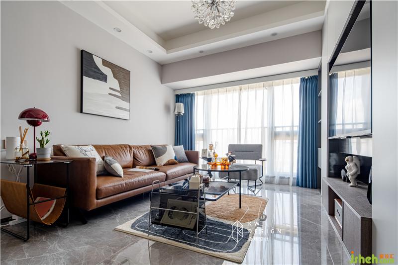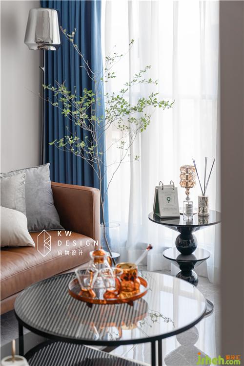 窗簾選擇與棕色沙發(fā)撞色的寶藍色,讓空間更加藝術且個性。