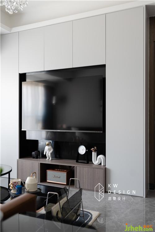 取消電視和沙發(fā)背景造型,改用簡單大氣的淺灰色墻漆打底,平柱到頂的電視柜,滿足收納的同時讓空間更加規(guī)整。