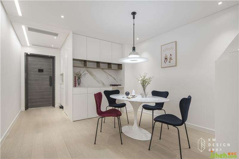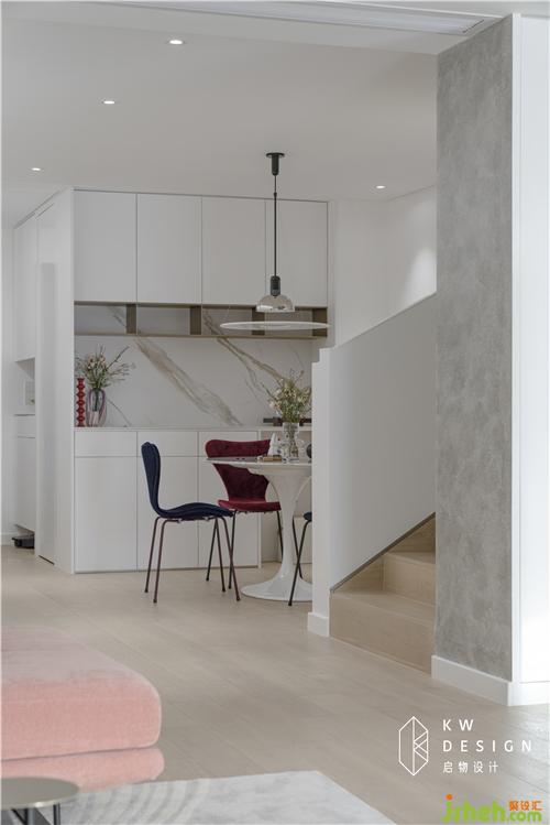 玄關和餐廳原本采光不佳,室內設計師采用大面積的白色打底(柜子,墻,吊頂,門),另增加光源,明亮空間。吊頂靠墻內凹做陰影縫避免后期天花與墻體的接縫處開裂,搭配遞進燈帶,凸顯光影立體效果,增加進門的氛圍感和儀式感。