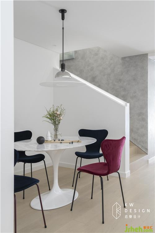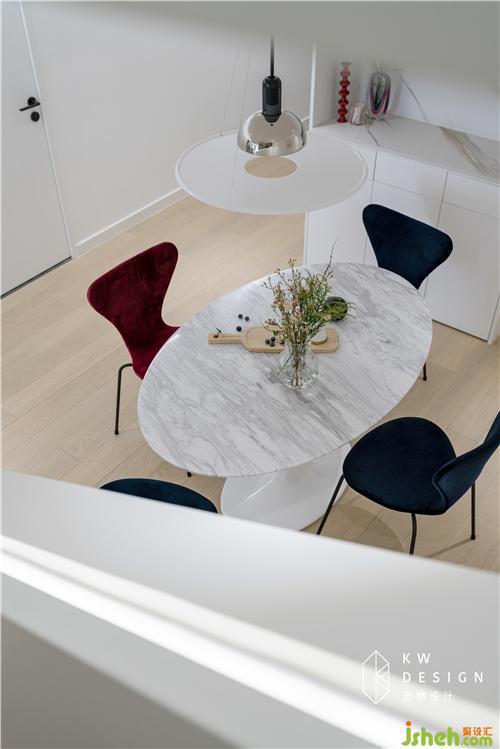 跳脫傳統(tǒng)餐桌非圓即方的思維,這次我們選的是橢圓形的雪花白大理石餐桌,增加空間的趣味性,柔美的曲線造型搭配絲絨蝴蝶椅,皇室藍和勃艮第紅裝點純白空間,優(yōu)雅的Flos frisbi吊燈提供溫馨氛圍,在這樣時尚與精致的用餐空間里,是味蕾和視覺的雙重享受。