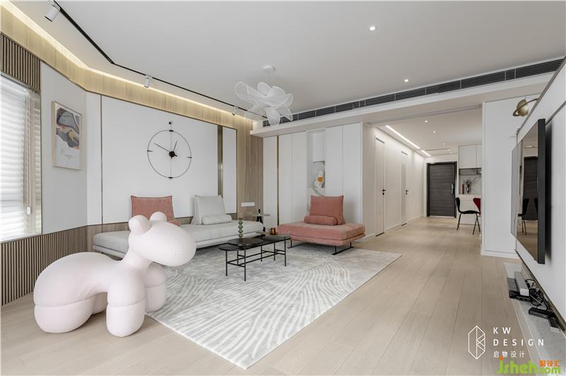 硬裝造型以有溫度的木飾面打底,冷峻的金屬材質和石材貫穿其中,軟裝以細形體柔和造型的家具和配飾(掛鐘,茶幾,吊燈)為主,搭配符合少女心的夢幻顏色(沙發(fā)的珊瑚紅,ponychai的淺粉色)平衡空間中的硬朗和柔和,映襯主人工作與生活不同的精致面,貼合著主人堅毅也溫柔的精神世界。家,就該是主人的樣子。