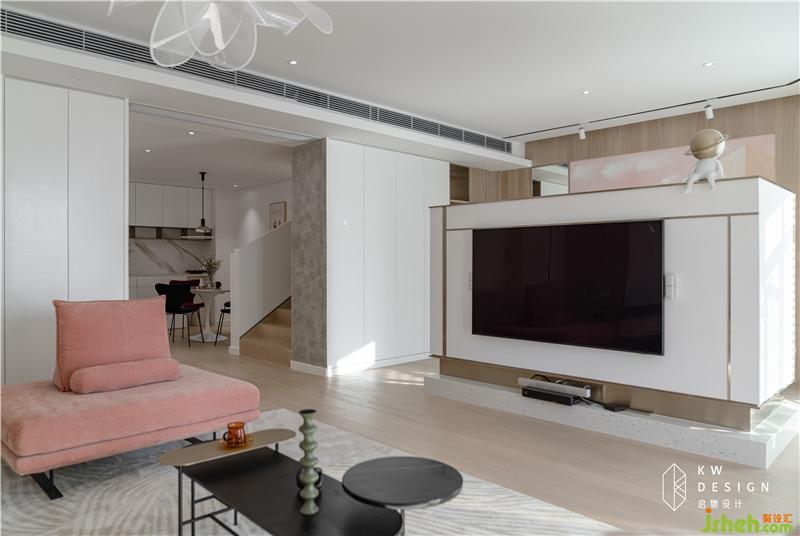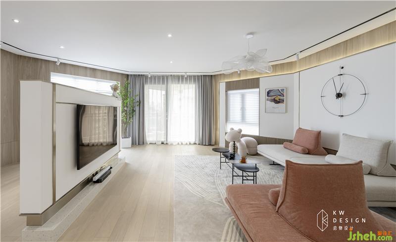 因為客廳的采光不錯,與餐廳的配色形態(tài)是區(qū)分開的,五邊形的結構室內設計師希望營造的是圍合,包覆的感覺,無論是獨處還是聚會,都有不同的氛圍感受。所以沙發(fā)背景的隔屏,電視墻的造型以及天花軌道燈的設計都是以半圍合的形式。