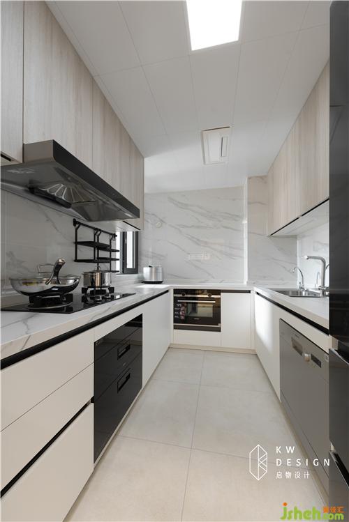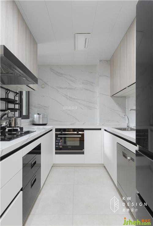 封掉進(jìn)陽臺(tái)的門,廚房做u字形,利用率達(dá)到最高。整體配色以簡潔為主,淺木色配白色,臺(tái)面用耐高溫好打理的巖板,柜子還是統(tǒng)一的無拉手無頂封板設(shè)計(jì)。
