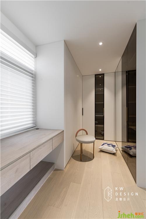 原本床頭位置也有一個門通向衣帽間,兩個口,動線會靈活一些,因為風(fēng)水原因,取消了。但同時U字型的衣帽間也增多了收納容量。黑框灰玻和鏡面材質(zhì)讓空間更加時尚精致。