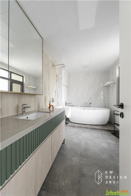 屋主很喜歡原木的質(zhì)感,所以把原木色也延續(xù)到衛(wèi)生間,不過是以木紋裝上墻的形式,搭配爵士白墻磚也是很好看的。