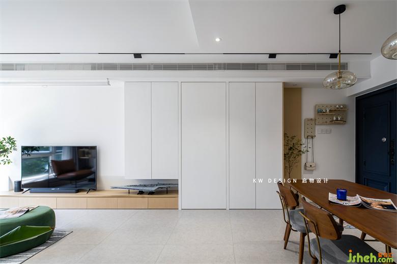 主臥設(shè)白色隱形門片,與玄關(guān)和客廳收納融為一體,深圳家裝設(shè)計(jì)過道吊頂增加黑色長條形軌道燈為白色立面增加層次感。