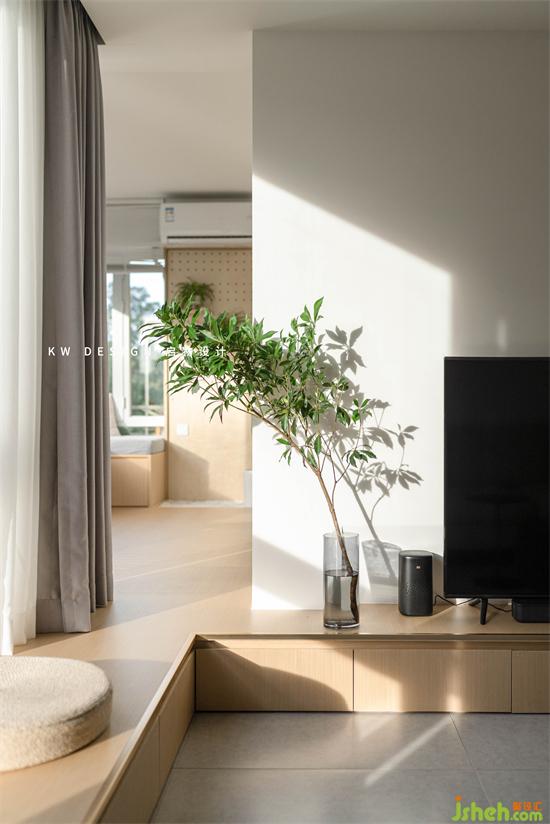 原木地臺從電視墻延伸至窗臺和陽光房,下方做抽屜滿足日常物品和家中大量的書籍收納,平臺形成可臥可坐的愜意休閑區(qū)。有朋友小孩過來也可喜歡在這里玩耍了。
