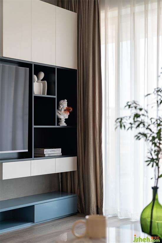 大電視柜隆重氣派,是一個(gè)隱藏式的集中收納區(qū)。為了不顯厚重,柜體沒有到頂。采用了斷裂、鏈接加懸浮的方式,靈巧又很有結(jié)構(gòu)美感。