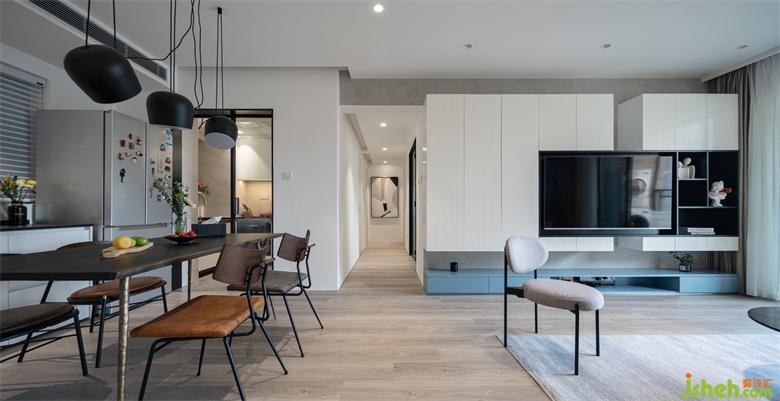 這個(gè)角度可以直觀客餐廳玄關(guān)的通透明亮。家裝設(shè)計(jì)沙發(fā)與電視柜2.6m的距離看電視是比較舒服的。