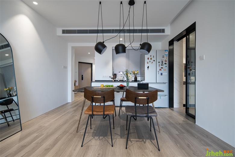 與客廳相比,餐廳的比重偏小,選用一款比較隆重的吊燈,抓人眼球,用餐也很有儀式感。聯(lián)和餐邊柜,冰箱這里組合成了一個(gè)輕食區(qū),偶爾下午還可以在這里喝喝咖啡,吃吃甜點(diǎn)。