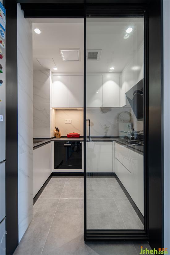 廚房門由原來的推拉門改成內(nèi)藏式的,可以全部推進(jìn)墻后隱藏起來。廚房采用的不銹鋼門套,極窄極細(xì),外觀更簡約。