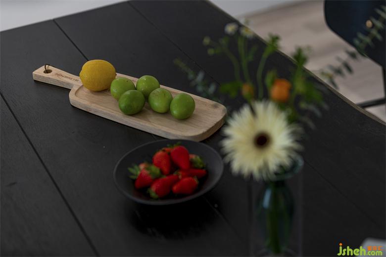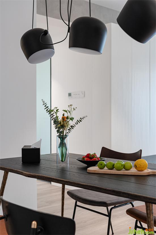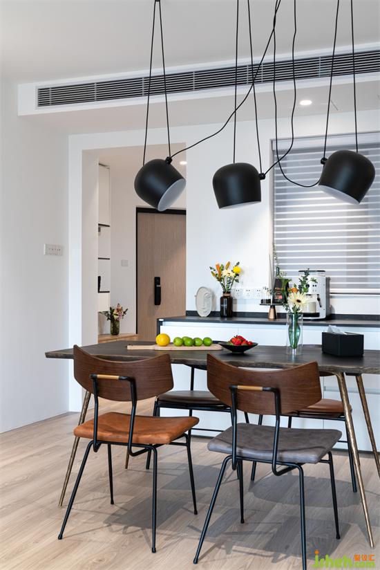 大受歡迎的香格里拉簾透光、保護(hù)隱私還很貌美。餐邊柜臺面用了黑花紋的盤古巖板。單單白色的柜子未免有些單調(diào)。且?guī)r板臺面精致、好打理。