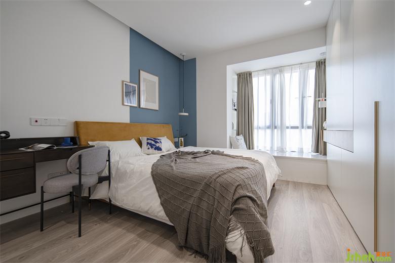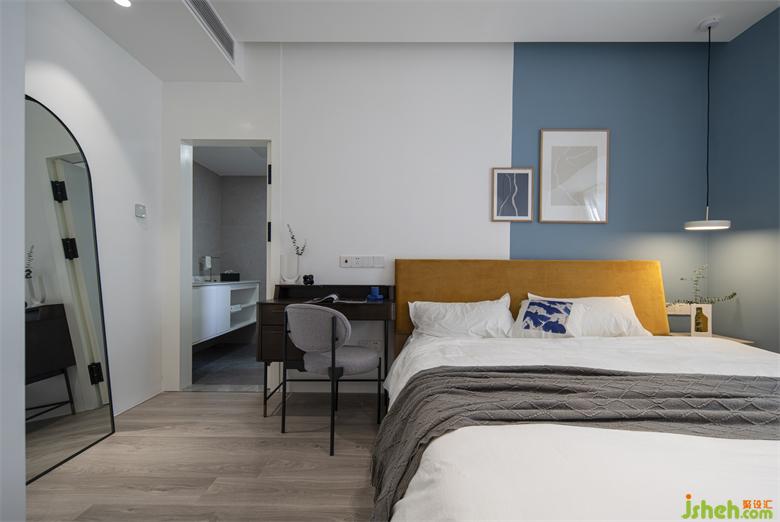 主臥無主燈設(shè)計,采用反光燈帶、邊角吊燈、燈泡凹陷射燈等間接燈光來照明。背景采用客廳同款藍(lán)色局部色塊加以點(diǎn)綴。家裝設(shè)計因?yàn)槲葜飨矚g家里明亮一點(diǎn),所以全屋基本保持白墻。都是小面積使用藍(lán)色色塊。