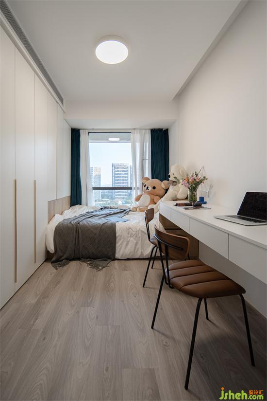 榻榻米延伸到飄窗臺上面,利用飄窗臺。雙人書桌加滿墻的收納柜。榻榻米也暗藏收納屜,充分利用空間。