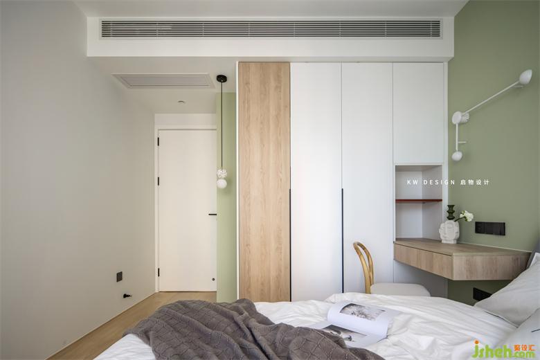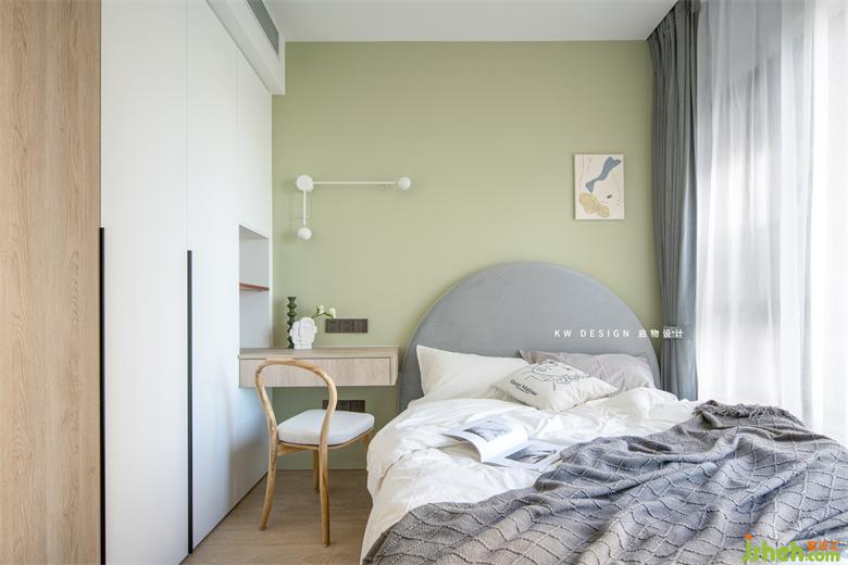 因?yàn)闃I(yè)主還沒(méi)有小孩,所以這間房也會(huì)用作客臥,就不希望設(shè)計(jì)的太過(guò)童趣。在全屋的設(shè)計(jì)中,兒童房跳了一個(gè)灰綠色(實(shí)際)。整體也是比較時(shí)尚簡(jiǎn)約的設(shè)計(jì)。