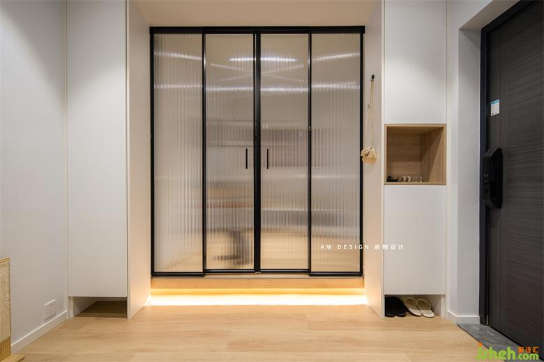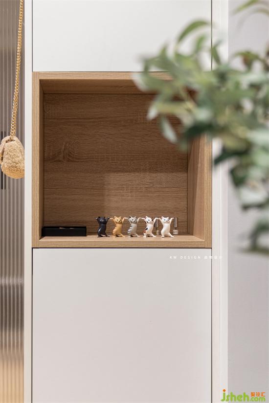 進(jìn)門懸空的鞋柜,從下到上依次可安置:居家拖鞋、常穿的鞋子、回家隨手放下的鑰匙包包、不常穿的鞋子。