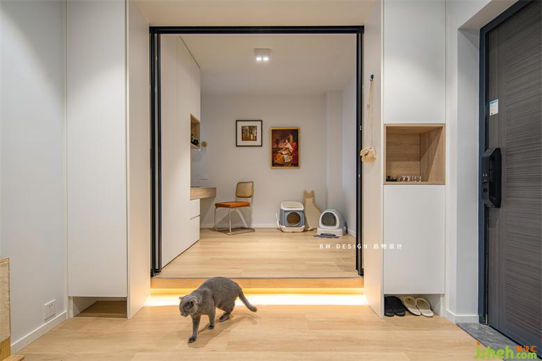 貓主子們的飯盆、貓砂盆安置在角落。抬頭就是兩幅提亮空間的藝術(shù)畫。家裝設(shè)計(jì)不知道日日穿梭其下,受藝術(shù)感染的貓咪會(huì)不會(huì)變的更聰明靈性呢?