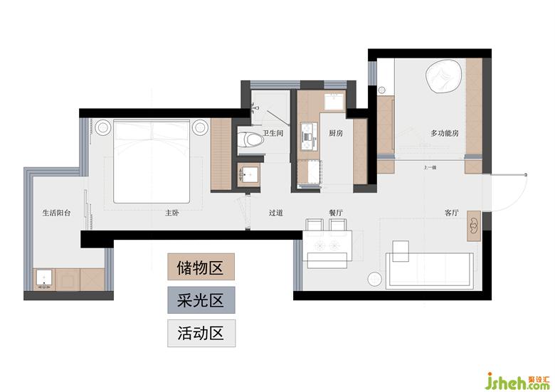 1:入戶靠近客廳的活動(dòng)墻拆除,采用內(nèi)藏式玻璃推拉門,增強(qiáng)開放性,有利于多功能房和客餐廳的互動(dòng)性,采光和空氣流通。進(jìn)門的視野也變開闊??繅υ鲈O(shè)兩組收納柜和投影幕布。
