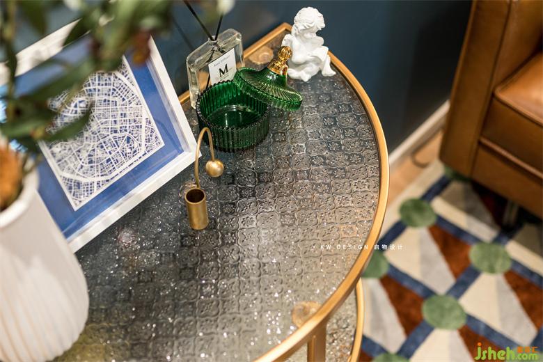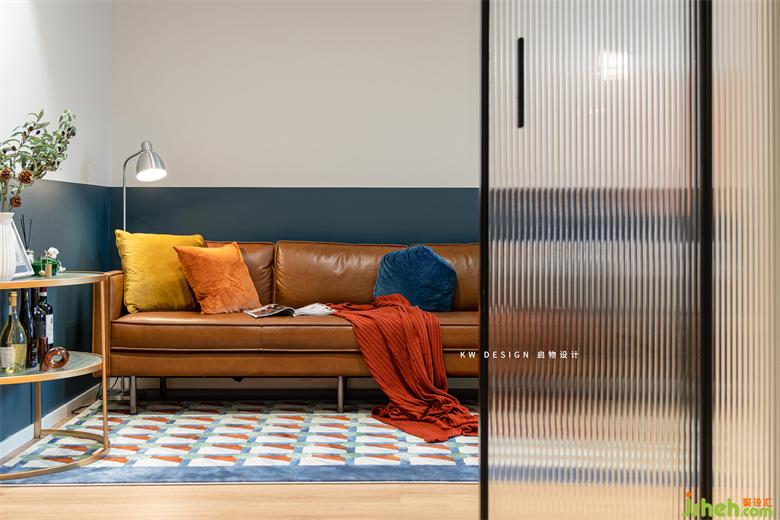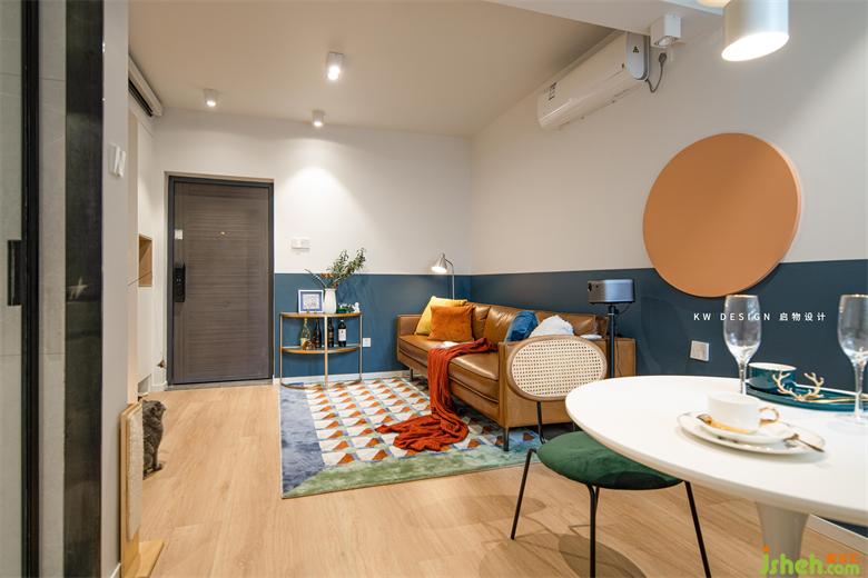北歐表情的棕色沙發(fā)搭配落地銀色銅燈,精致唯美。家裝設(shè)計(jì)拼色幾何地毯幾乎搭上了客餐廳空間的所有色系,仿佛一個(gè)集大成者。墻面蔚藍(lán)色半墻浮上圓形橙色色塊,不禁讓人聯(lián)想到蔚藍(lán)的海面,燃燒似火,懸浮其上的落日,浪漫愜意。創(chuàng)意給空間加分。