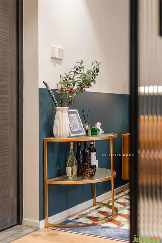 客廳原來放鞋柜的地方換成了置物邊幾,上面擺滿了新奇小物件,鮮花和美酒。是個(gè)望之欣喜的小角落。