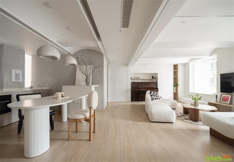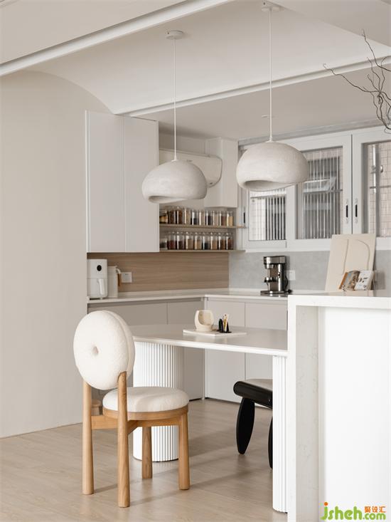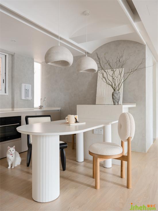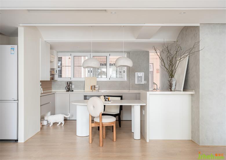 與客廳的彈性布置不同,餐廳常態(tài)化的生活場景更需要考究尺度和布置,連接客廳與輕食區(qū)的餐桌采用圓潤的形體,金桂大廈家裝設(shè)計(jì)白色塊面虛實(shí)交疊弱化分界,由自然流暢線條勾勒連接用餐儀式。