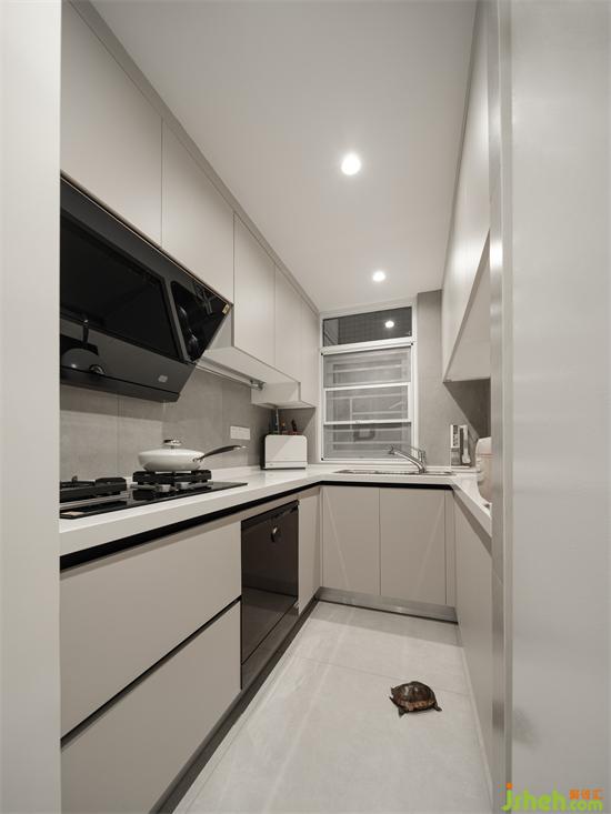 中廚改變了進(jìn)門方向朝向過道,金桂大廈家裝設(shè)計(jì)獨(dú)立的烹飪區(qū)避免了爆炒時(shí)噪音與油煙對客餐廳的影響,U型櫥柜上下做滿了收納,80公分的過道是小烏龜?shù)娜粘;顒?dòng)區(qū)。