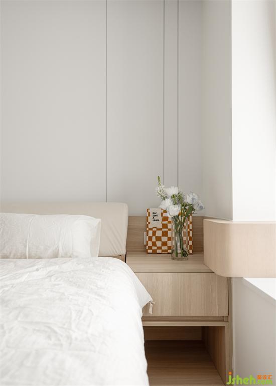 床頭柜上搭設(shè)木質(zhì)結(jié)構(gòu)延伸至窗臺(tái)增加收納臺(tái)面。