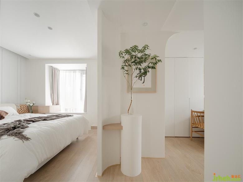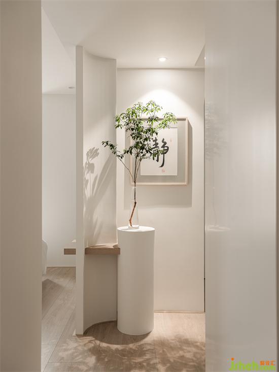 主臥進(jìn)門處由圓弧結(jié)構(gòu)圍合了一處端景,墻上是阿姨的書法作品。金桂大廈家裝設(shè)計(jì)靜字搭配綠植和光影效果,為簡約空間增添一絲絲禪意氛圍,渲染閑適恬淡意境。