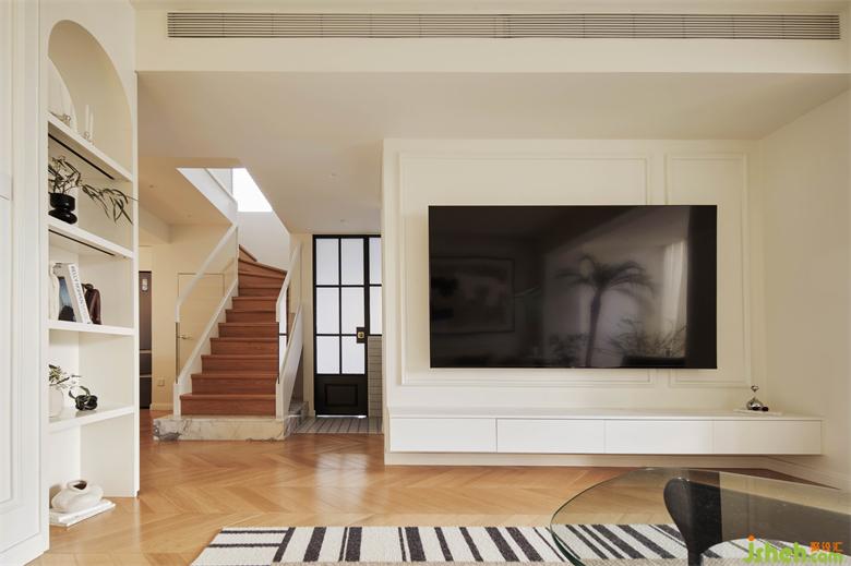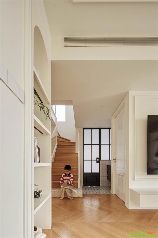 原先由餐廳到客廳的轉(zhuǎn)彎處是兩個(gè)拐角相沖,過(guò)道擁擠,把長(zhǎng)輩房進(jìn)門位置內(nèi)進(jìn)后擴(kuò)大了轉(zhuǎn)角空間,佳兆業(yè)悅峰復(fù)式裝修設(shè)計(jì)一側(cè)做弧形開放層板,另一側(cè)做懸挑柜補(bǔ)充客廳收納,弱化生硬轉(zhuǎn)角,舒適順暢的生活動(dòng)線也得以釋放。