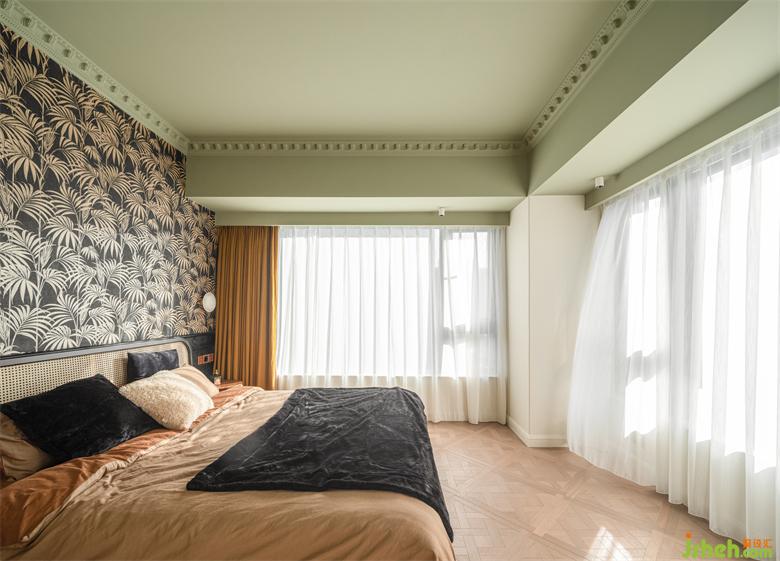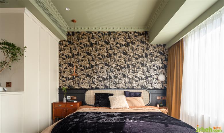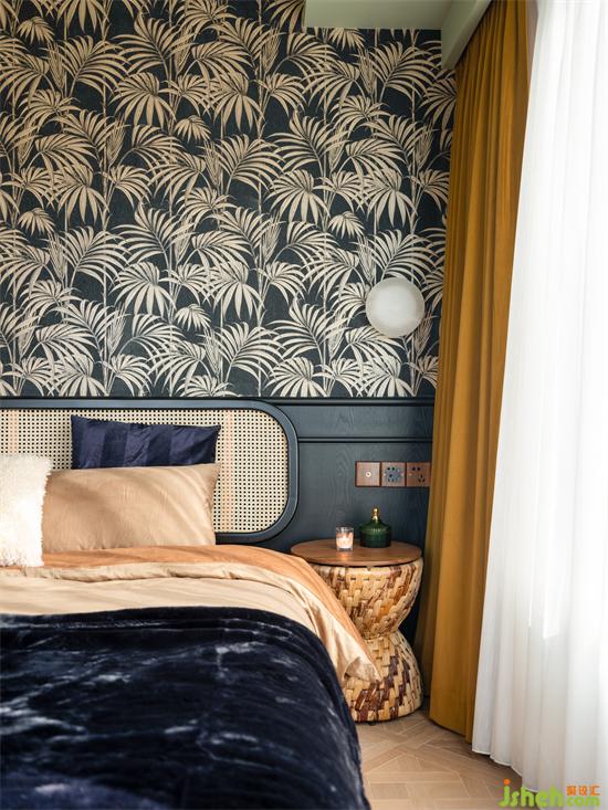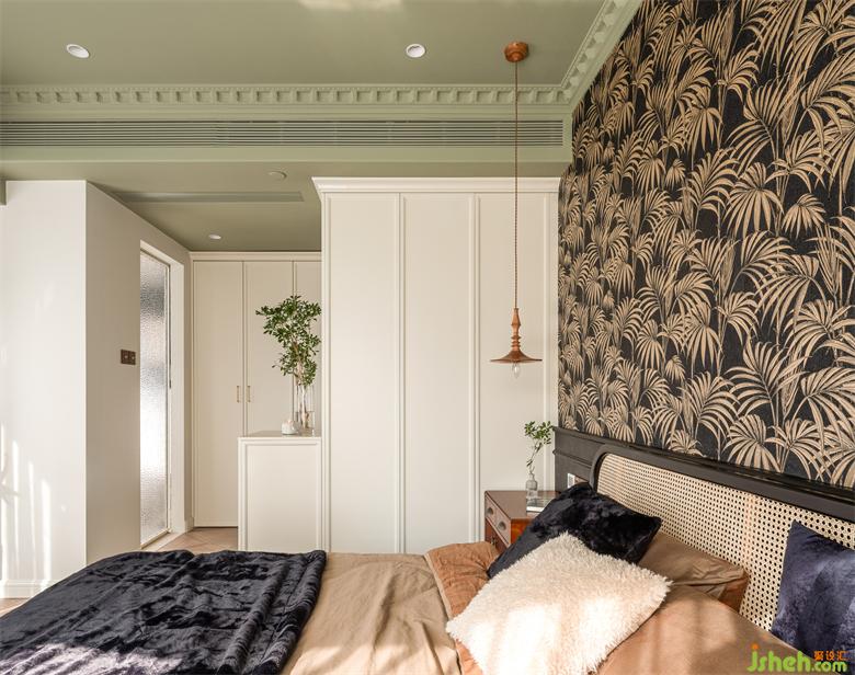 睡眠空間用色更加跳脫大膽,南洋風(fēng)不可缺少的清涼與熱烈由墻至頂大面積渲染,床頭背景采用黑白相間的棕櫚葉裝飾壁紙,抹茶綠鋪陳天花,具象的綠意與夢幻的香薰裝點其中,為空間注入大自然的生機以及探索的神秘感。