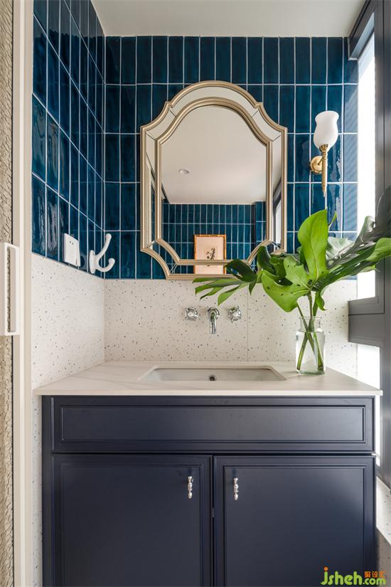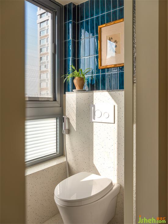 藍(lán)色系花磚與水磨石鋪陳的主衛(wèi)空間濃郁又清爽,兩分離布置實現(xiàn)日常的簡潔高效。