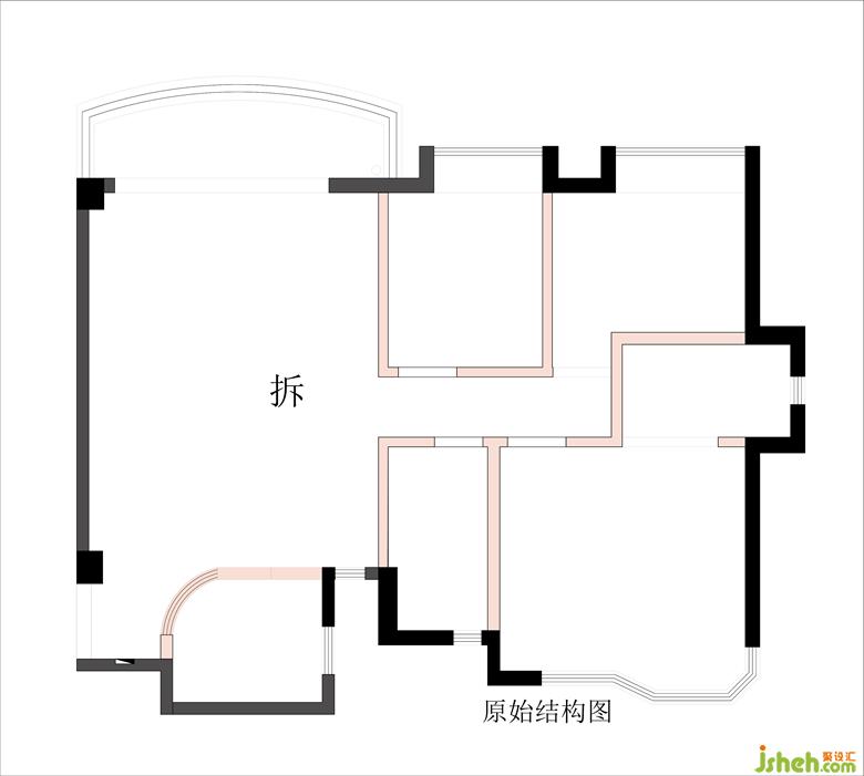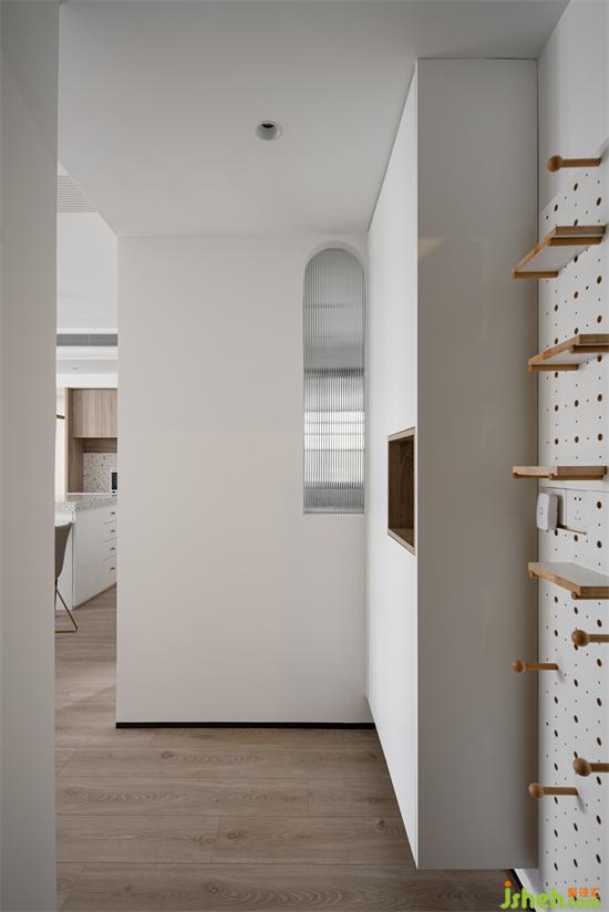 進(jìn)門玄關(guān)與廚房的白色隔墻開了一扇拱形窗洞,長(zhǎng)虹玻璃呈現(xiàn)的光影效果是流動(dòng)不確定的,給了這片白墻以生命和靈動(dòng)氣息。
