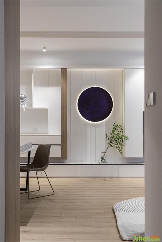 考慮人員結(jié)構(gòu)空間上盡量做減法,以實(shí)用折中的現(xiàn)代北歐風(fēng)格呈現(xiàn),而因戶型朝向屋子視野被前一棟的居民樓完全擋住, 只有部分綠化可以看到,我們?cè)诳臻g上又做了一些加法。以“星空”為主題,把星辰大海的藍(lán)和無形的浩瀚意向留在這個(gè)新家,給與家人忙碌奔波之余一處寧靜舒適且治愈的居心地。