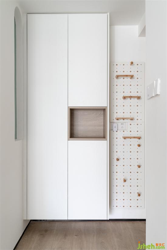 ?考慮廚房的使用頻率和重要性保證其空間尺度能滿足高效的u型櫥柜布置,進(jìn)門玄關(guān)沒有借用其空間,而是靠門垛處做了一組鞋柜結(jié)合洞洞板的形式,滿足進(jìn)出門的收納和實(shí)用需求。