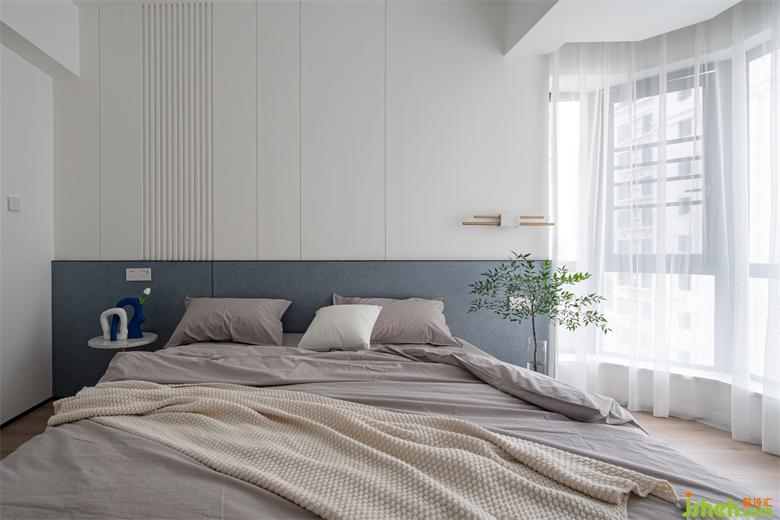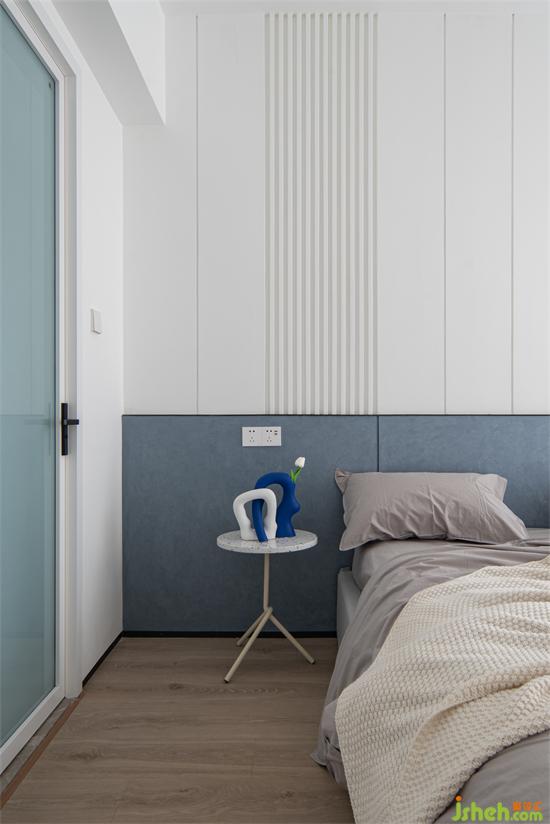 延續(xù)藍(lán)色主題,以半高的不規(guī)則藝術(shù)肌理作床頭背景裝飾,豎向格柵和工藝縫豐富白色背景,深圳豪峰園家裝設(shè)計(jì)搭配金屬與石材穿插的線性壁燈,簡約大氣。