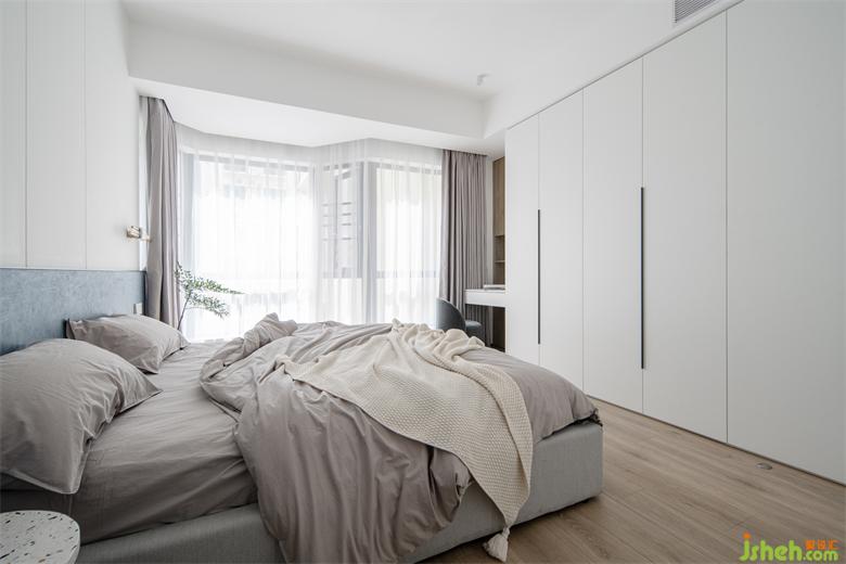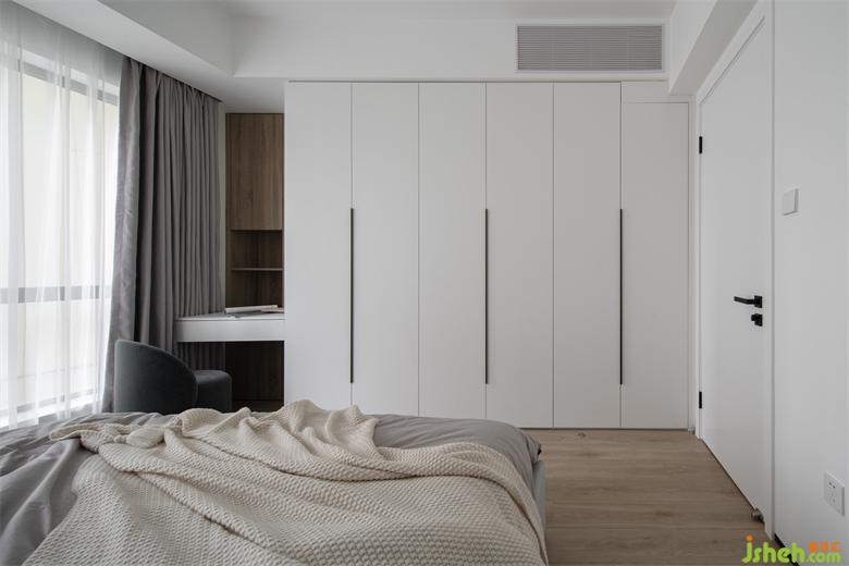 因?yàn)樾∨笥堰€小短期還是會和大人一起睡,床頭兩邊沒有定制書桌和床頭柜,深圳豪峰園家裝設(shè)計(jì)可以自主擺放嬰兒床,取消床屏留出的更大過道空間也方便小朋友自由活動。