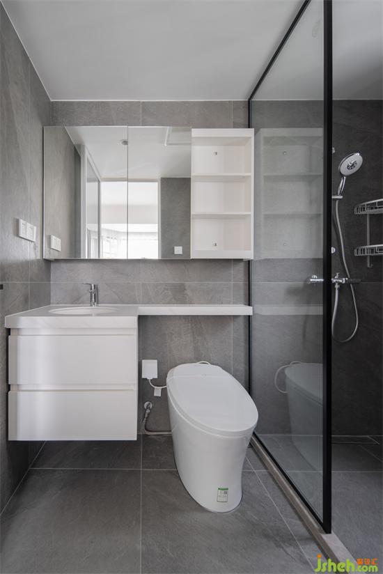 不同于干區(qū)的細(xì)膩和繽紛,濕區(qū)通鋪粗狂紋理的灰色柔光磚,簡單干練也好清潔。