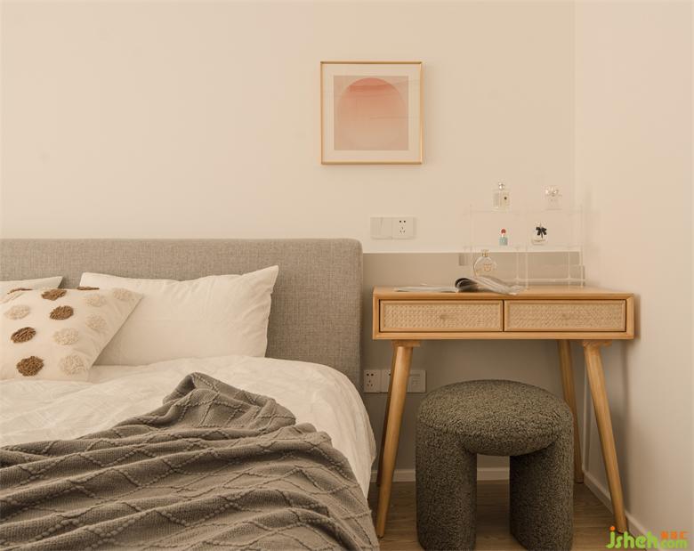 臥室收納大部分集中在床尾頂天立地的柜子里,南山恒立心海灣家裝設(shè)計(jì)床頭梳妝區(qū)搭配簡易梳妝臺和亞克力收納架滿足裝扮需要。
