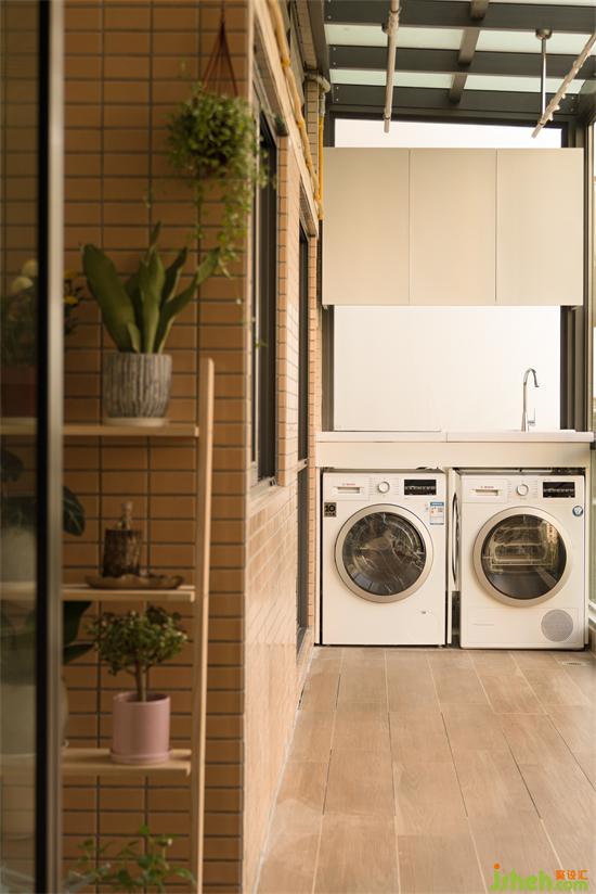 女屋主最愛的大陽臺,是栽花養(yǎng)草的居心地。保留了原始的磚墻,家政清潔區(qū)搭設(shè)了玻璃背面和頂棚,避免了陽臺上與陌生鄰居的尷尬對視,也為晾曬區(qū)隔絕了雨水。