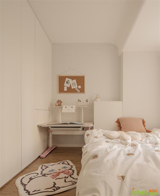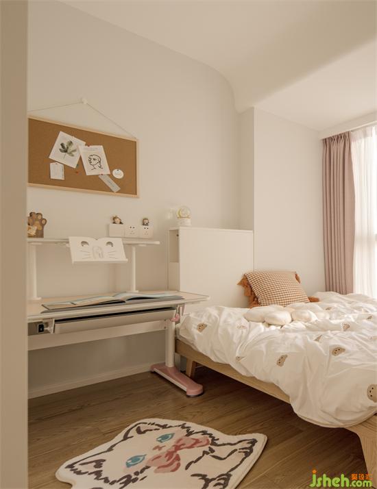 女兒房的床靠窗擺放騰出一米的升降學(xué)習(xí)桌,床頭定制平齊承重柱的半高收納柜,南山恒立心海灣家裝設(shè)計(jì)內(nèi)外部空間平臺方便小朋友存放可愛小物件。