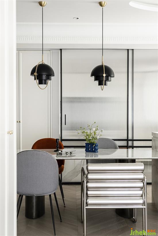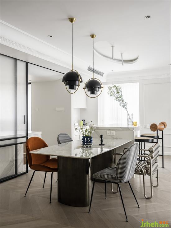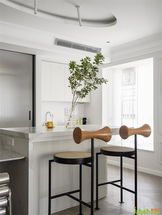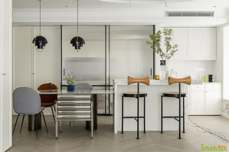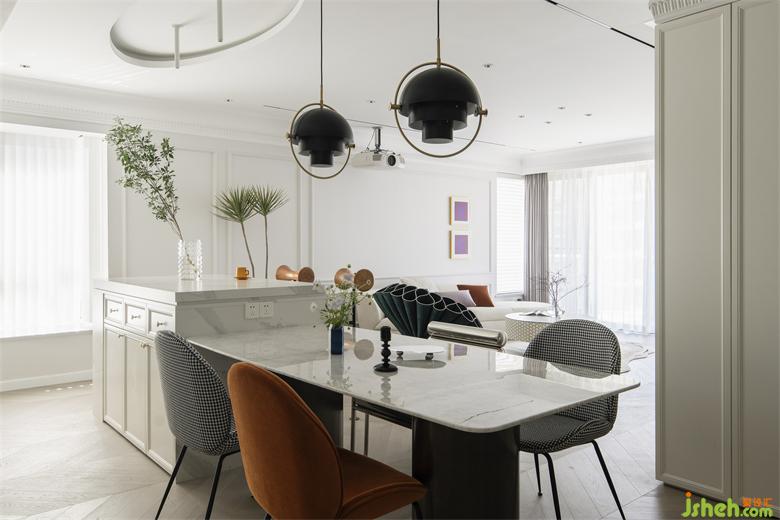 由爵士白大理石延伸的長跨度餐島臺區(qū),南山蘭溪谷家裝設(shè)計以不同材質(zhì)相同纖細(xì)柔美形體的軟裝搭配,豐富空間表情,多樣與統(tǒng)一的形式美學(xué)實現(xiàn)和諧又個性的煙火區(qū)。