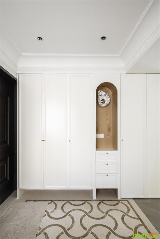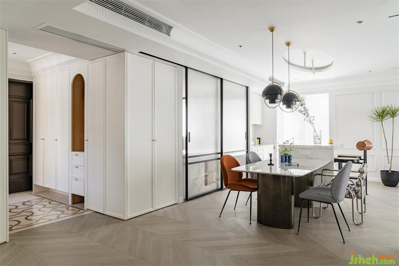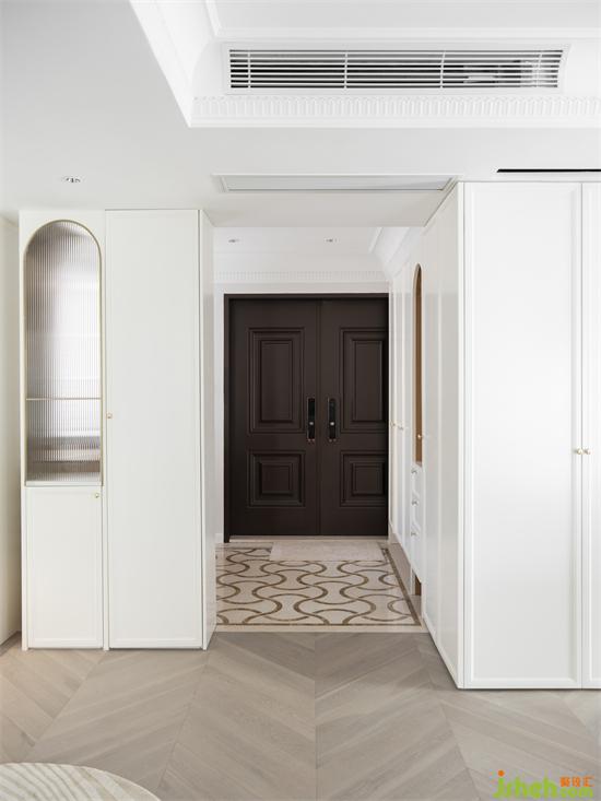 玄關(guān)鋪設(shè)大理石花磚作為落塵過渡區(qū),最大化的實現(xiàn)雜物和用具收納,南山蘭溪谷家裝設(shè)計利用通透的玻璃材質(zhì)和弧形線條,弱化結(jié)構(gòu)體量。