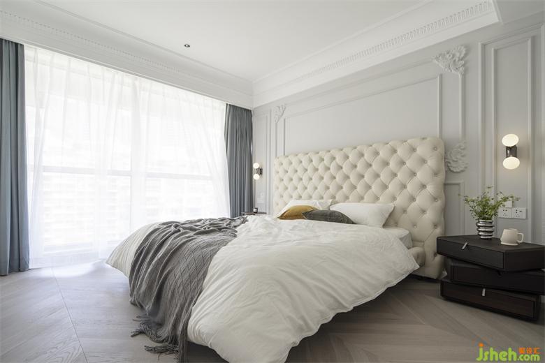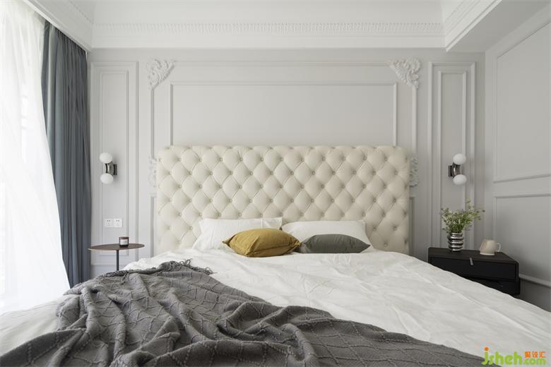 床頭背景運(yùn)用雕花、線條造型突出風(fēng)格特點(diǎn),搭配素凈、輕柔中性色調(diào)的功能家居,從整體上營造悠然自得的輕松柔和氛圍。